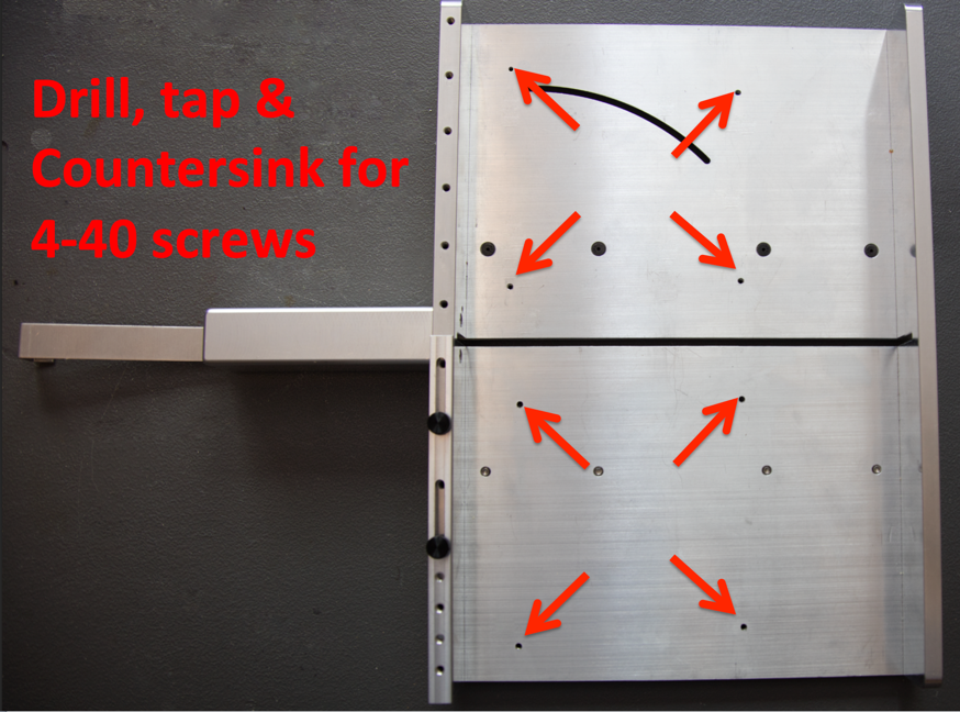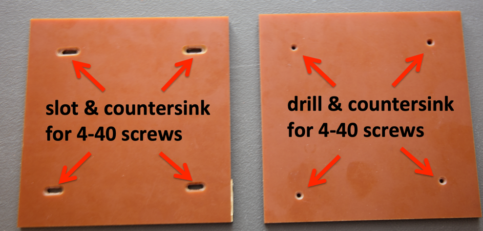 To make the jig, I cut 2 6” x 6” squares of ¼” phenolic sheet. I drilled and countersunk 4 #33 holes (body drill for a 4-40 screw) in the corners of one of the squares. I milled and countersunk 1/8” slots in the other square.