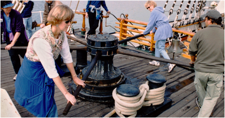 the capstan and the capstan is rotated by sailors pushing on poles stuck in the