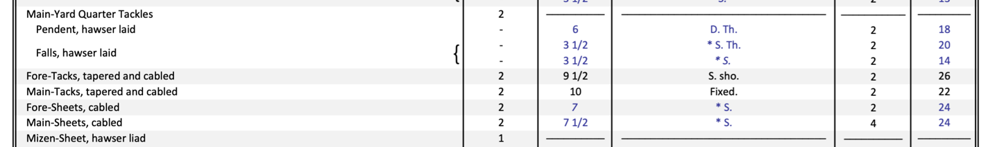 ropes and chains used in both the standing and running rigging. Some of the sizes on the drawings differ from