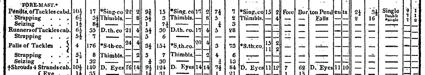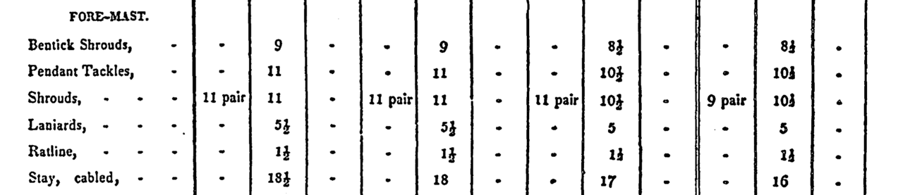 it shows the fore stays as being 10½ inch cabled 4-stranded rope. This matches what Duncan McLean wrote about