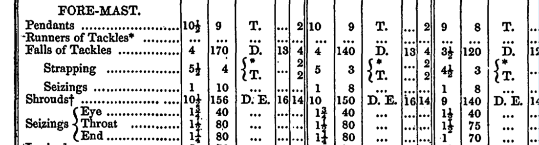 from 1849 also has a set of tables showing rigging lines for navy vessels and