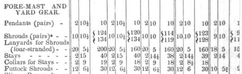 comparing the sizes for smaller ships and how the sizes of rope increased based